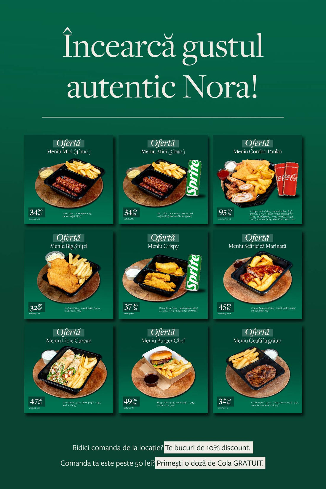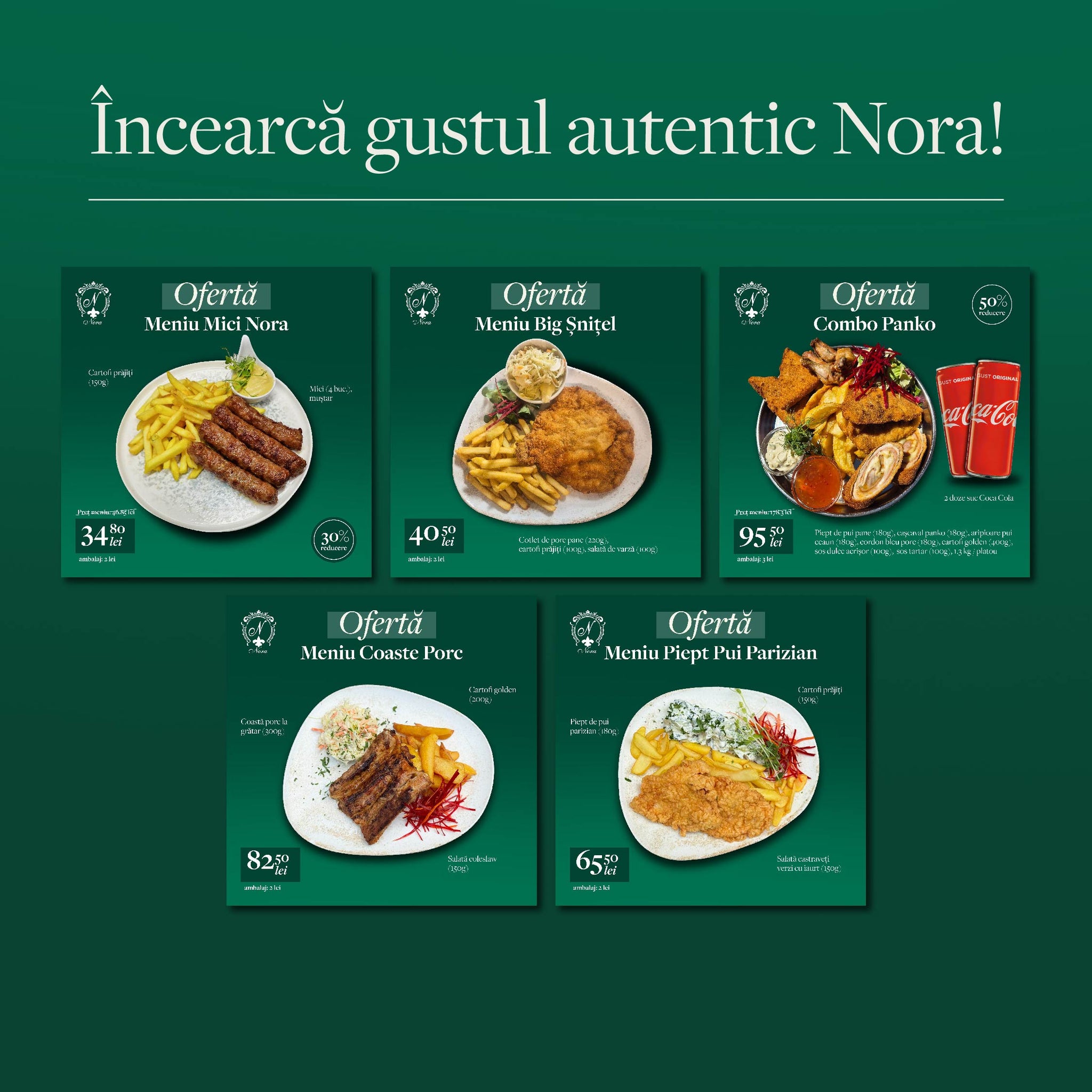 Desigur, comanda poate fi ridicată de la recepția Restaurantului Nora situat în Bld Dâmbovița, nr. 40. La plasarea comenzii selectați opțiunea: Ridicare împreună cu metoda de plată dorită.
