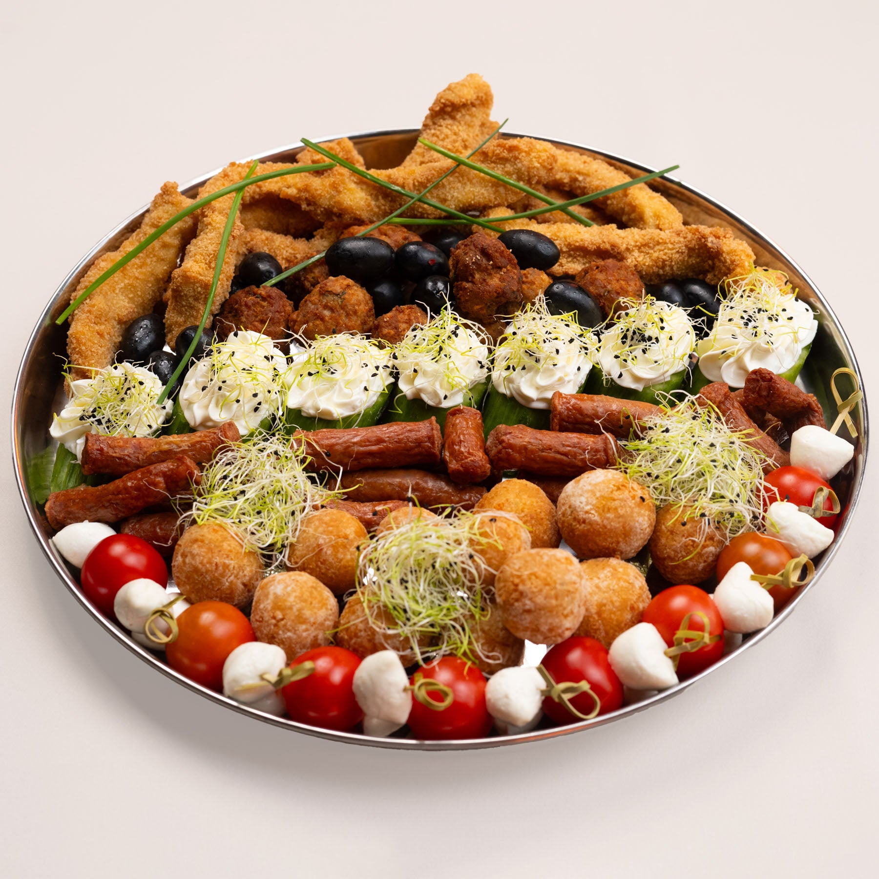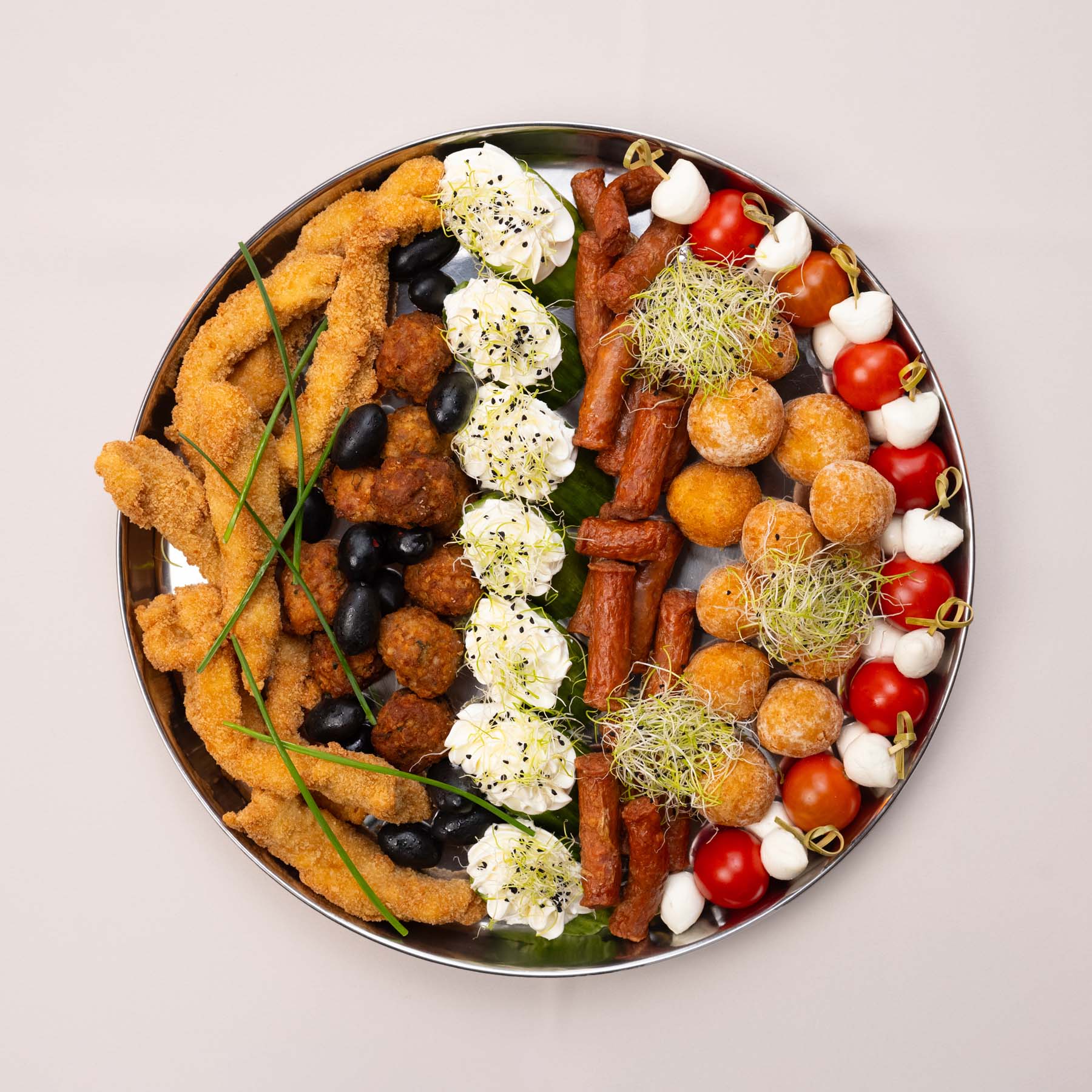 Bucurați copiii cu un platou conceput special pentru ei, încărcat cu crispy panko, bulgăre de cașcaval, mini-frigărui cu biluțe de mozzarella și roșii cherry, chifteluțe de pui, mini-cârnăciori, castravete cu mousse de brânză și măsline.