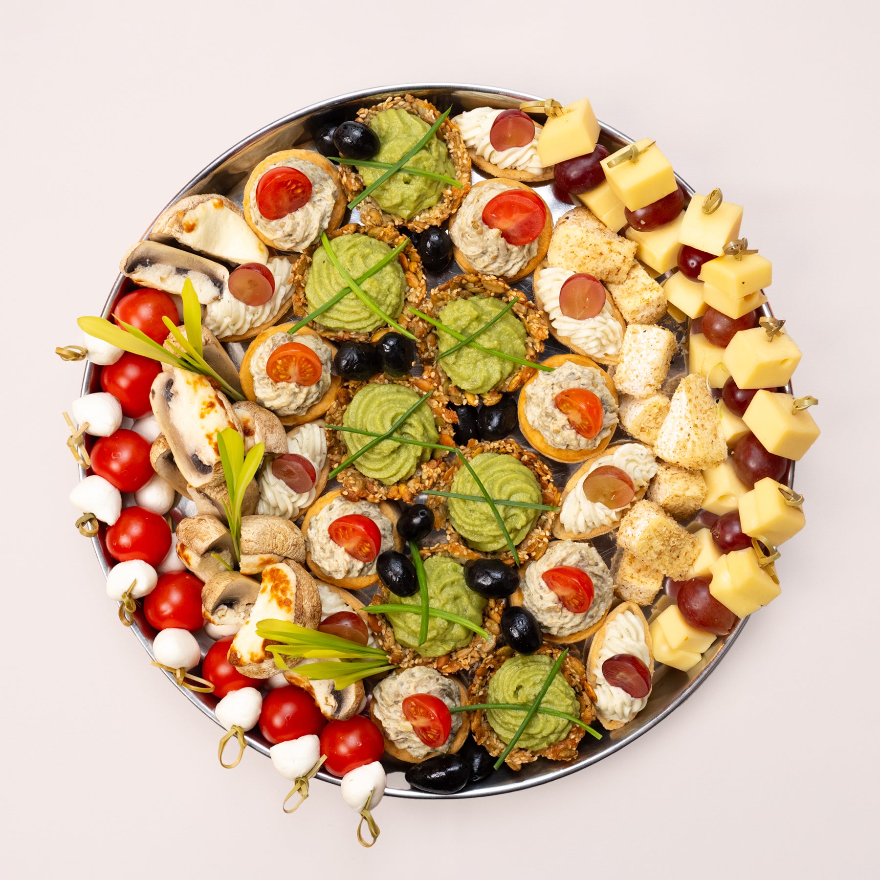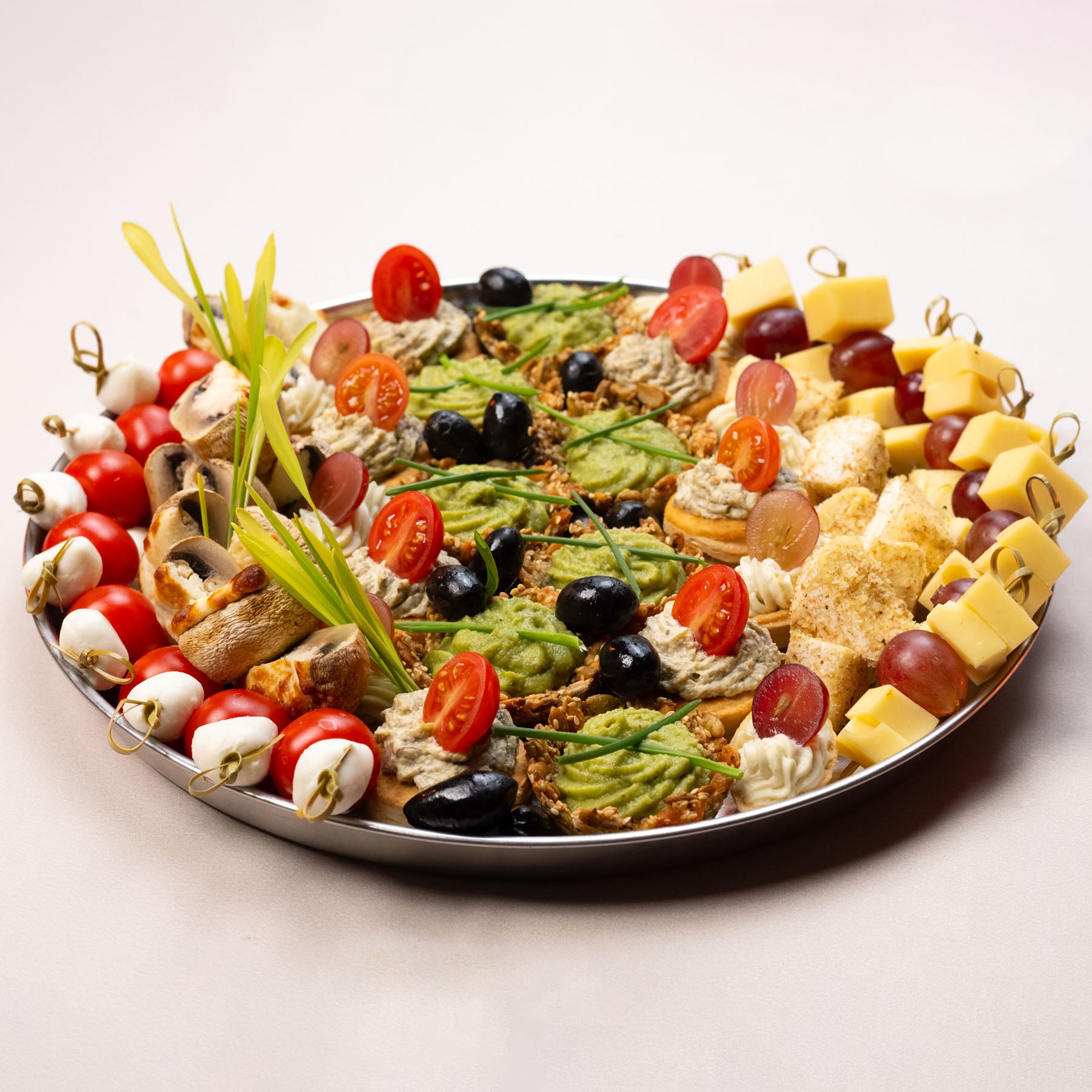 Încântați-vă invitații cu un platou vegetarian deosebit care include coșulețe din semințe cu guacamole, mini-frigărui Schweizer cu struguri, mini-frigărui caprese, biscotă cu vinete și roșii cherry, bărcuță cu gorgonzola, mini-champignon cu burduf, camembert cu nucă și măsline.