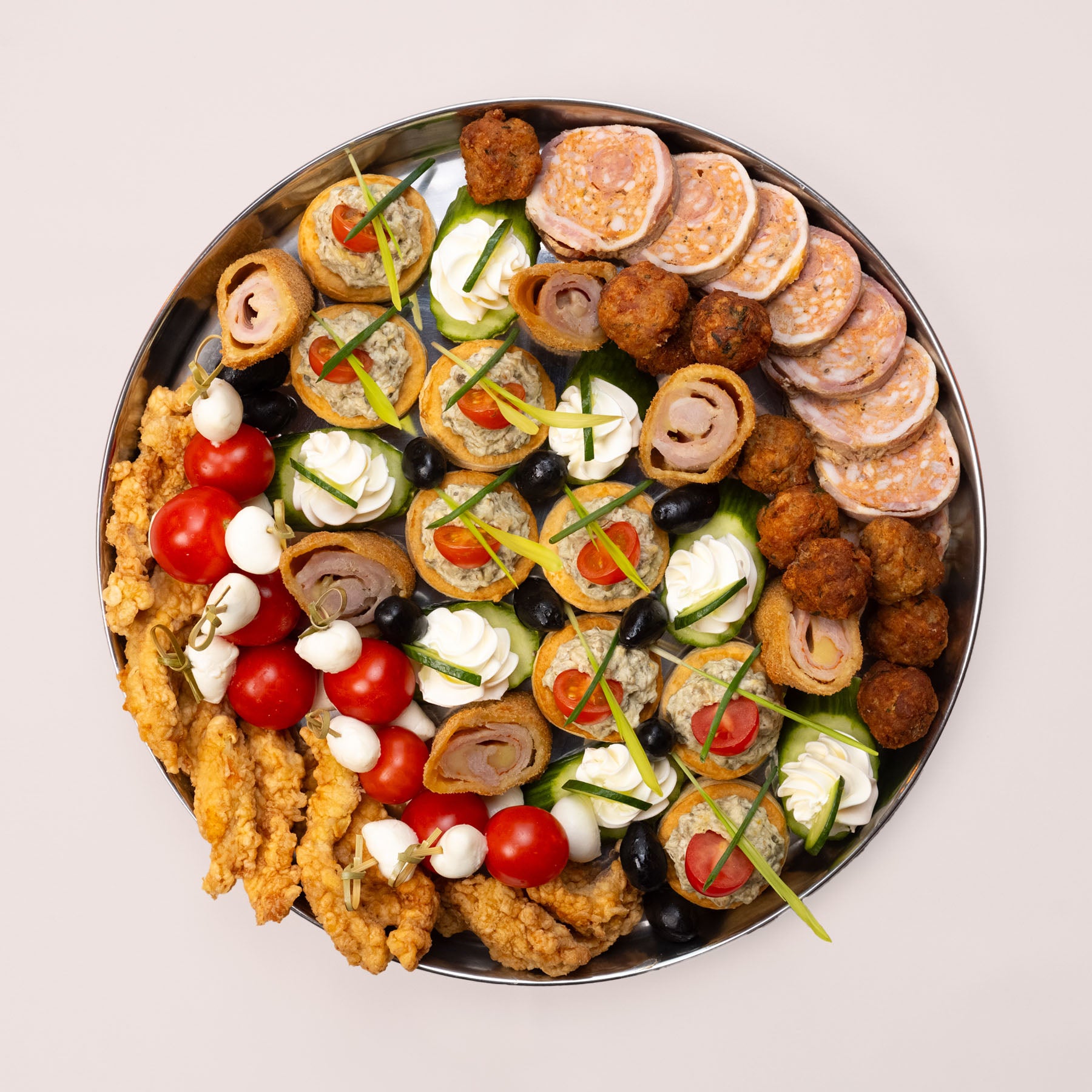 Savurați un festin clasic cu mini-cordon bleu, mini-șnițel de pui parizian, chifteluțe speciale, ruladă din cotlet cu cârnați, castravete cu pastă de brânză, roșie cu salată de vinete, mini-frigărui caprese și măsline.